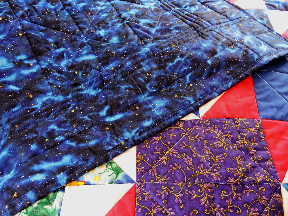 This quilt top was sitting around in my collection of quilt tops and I was reorganizing my fabrics at the same time, which happily resulted in finding that Halloween plaid backing fabric. I had originally purchased it to make a button down shirt, but I know myself better than I did and I’m not comfortable wearing shirts in full bright colors like that. Halloween plaid is perfect, however, for quilt backing fabric and within a few days, I had this quilt sandwich under the needle of my machine. It was done with freeform quilting – lots of experimenting and motif exploration – and I’m pretty pleased with how it turned out.